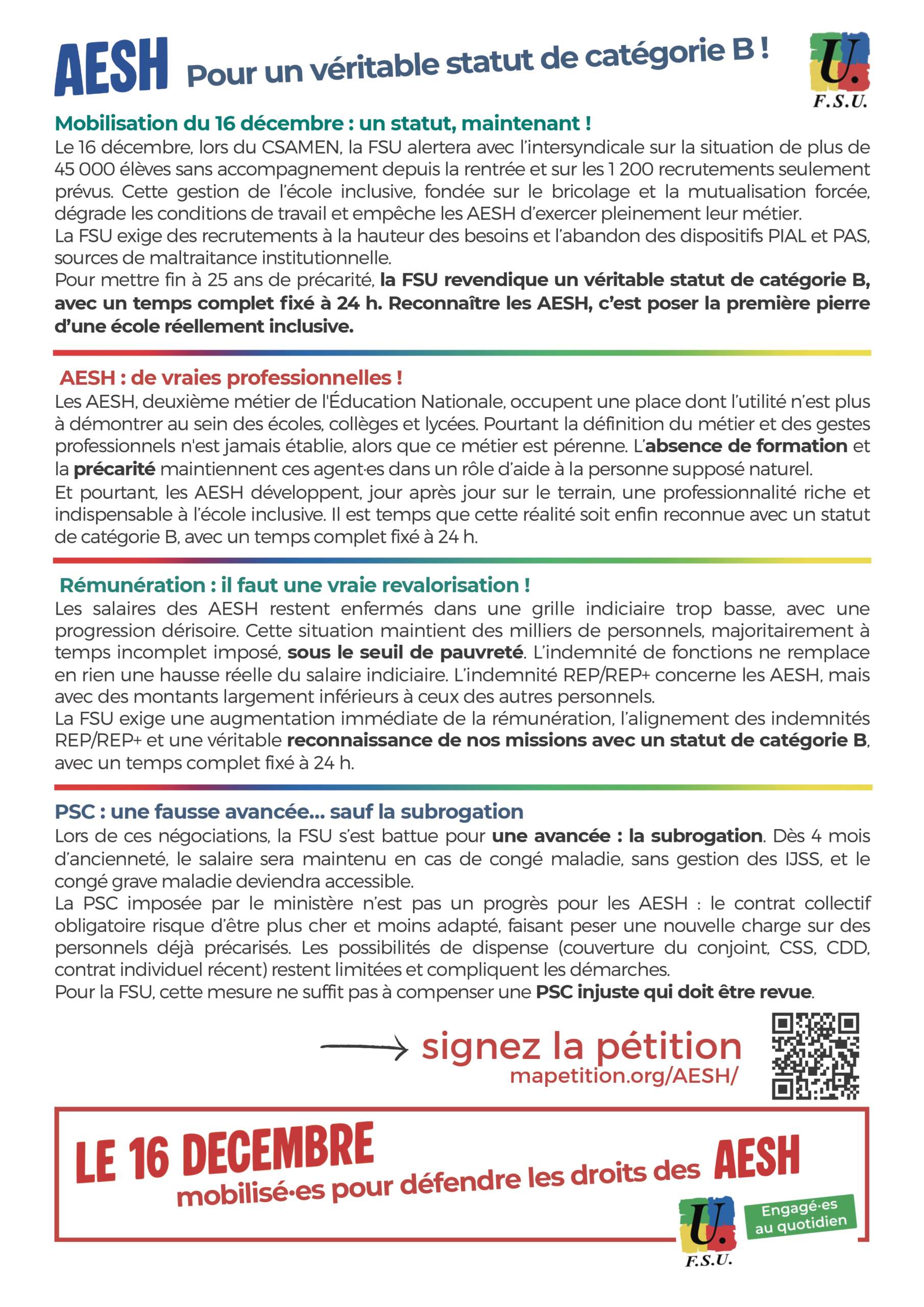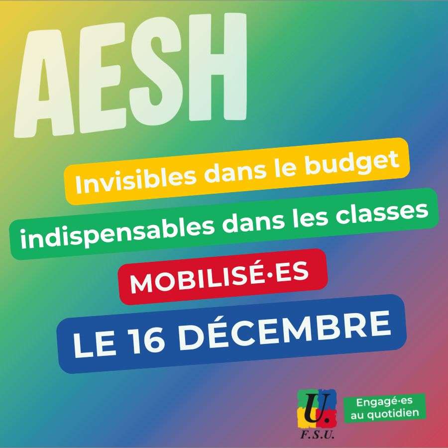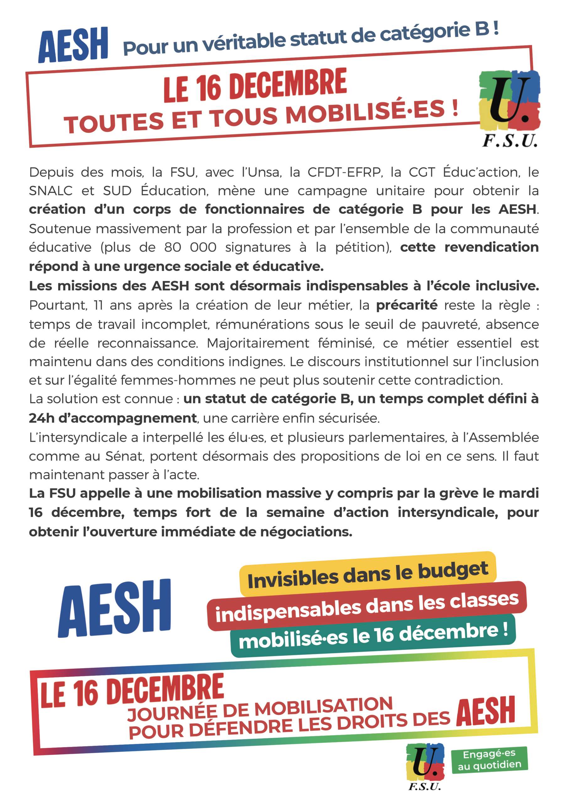Le 16 décembre, mobilisé.es pour les droits des AESH 2025-12-09T16:35:35+01:009 décembre 2025|Catégories : À LA UNE, Mobilisations|Mots-clés : ACTIONS, COMMUNIQUÉS| Partagez cet article ! FacebookXWhatsAppTelegramEmail Articles similaires 120 ans de la loi de 1905 : un principe pour faire société 120 ans de la loi de 1905 : un principe pour faire société 9 décembre 2025 Quand la vérité offense, la solidarité s’impose. Quand la vérité offense, la solidarité s’impose. 9 décembre 2025 Convention citoyenne sur le temps de l’enfant : plus d’inégalités à la clé ! Convention citoyenne sur le temps de l’enfant : plus d’inégalités à la clé ! 28 novembre 2025 Toutes et tous en grève et en manifestation le 2 décembre Toutes et tous en grève et en manifestation le 2 décembre 27 novembre 2025 Ensemble contre les violences faites aux femmes Ensemble contre les violences faites aux femmes 20 novembre 2025