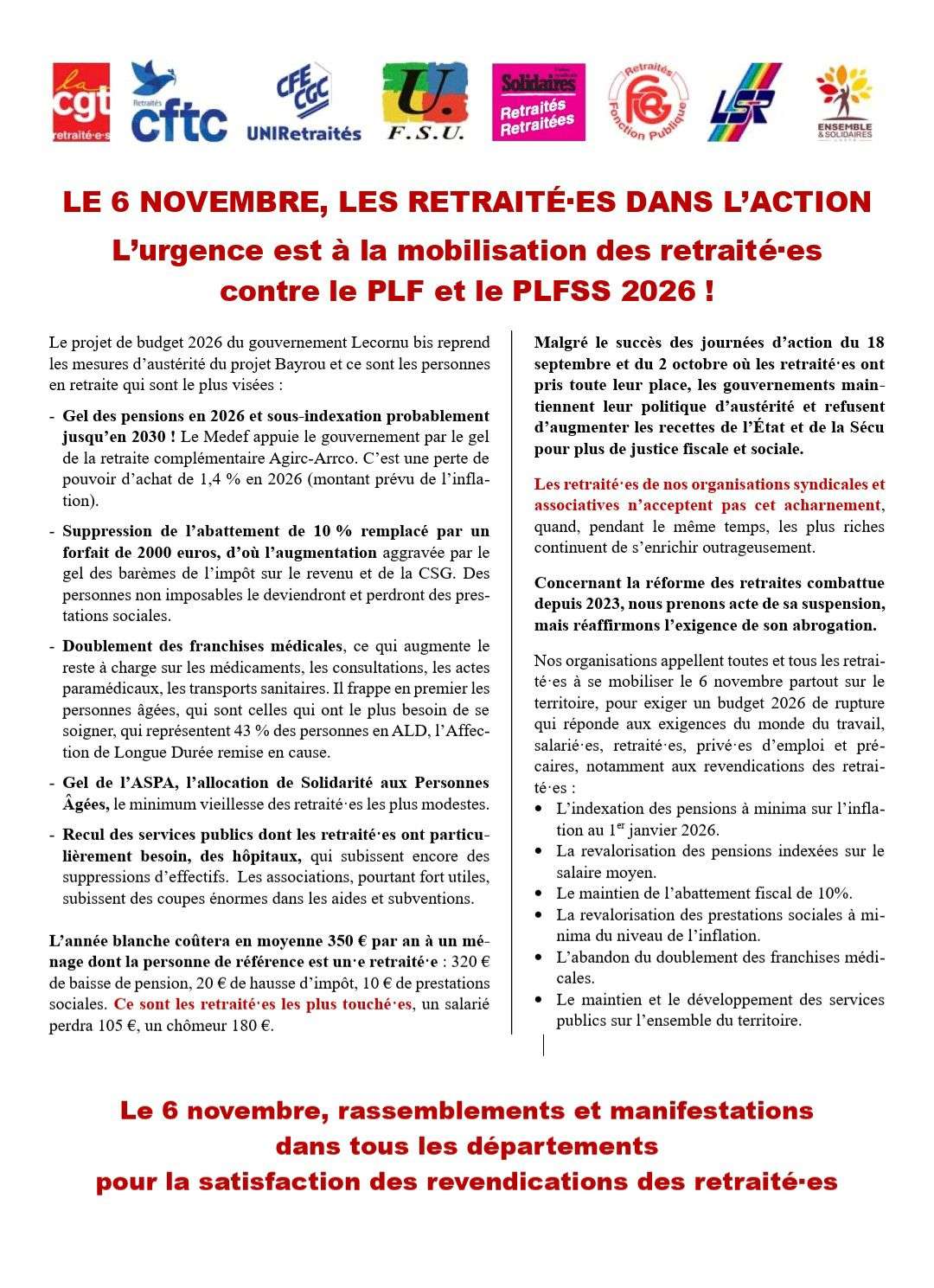 Le 6 novembre, les retraité·es dans l’action 2025-10-23T16:35:07+02:0023 octobre 2025|Catégories : À LA UNE, Communiqués, Mobilisations|Mots-clés : ACTIONS, COMMUNIQUÉS| Partagez cet article ! FacebookXWhatsAppTelegramEmail Articles similaires Maintenant, cette politique doit battre complètement en retraite ! Maintenant, cette politique doit battre complètement en retraite ! 16 octobre 2025 Face à la crise politique, la FSU s’engage pour porter des alternatives de justice et de progrès social Face à la crise politique, la FSU s’engage pour porter des alternatives de justice et de progrès social 16 octobre 2025 Lycées pros : stop au fiasco ! Lycées pros : stop au fiasco ! 9 octobre 2025 La Sécu est en danger, faisons la vivre ! La Sécu est en danger, faisons la vivre ! 25 septembre 2025 Le 2 octobre, toutes et tous en grève Le 2 octobre, toutes et tous en grève 25 septembre 2025