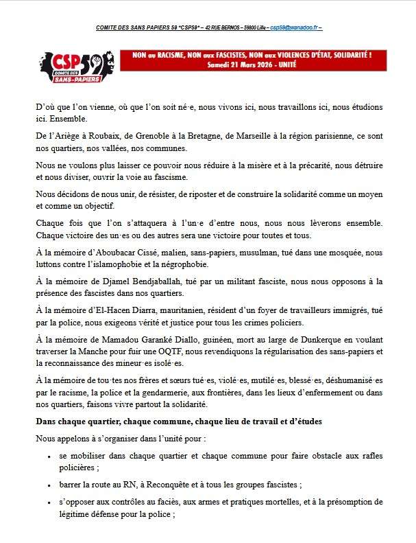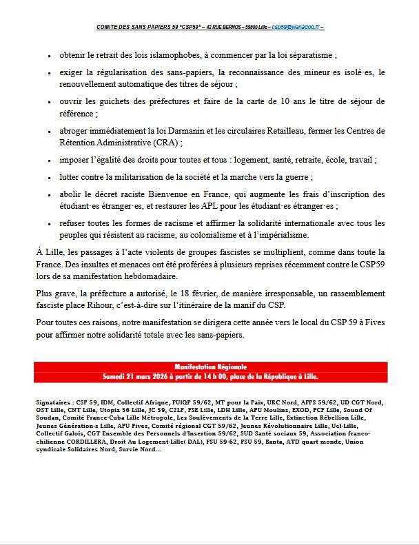NON au racisme, NON aux fascistes, NON aux violences d’Etat, Solidarité ! 2026-03-19T09:43:12+01:0019 mars 2026|Catégories : À LA UNE, Mobilisations|Mots-clés : ACTIONS| La FSU/59/62 appelle à se joindre à la manifestation régionale Samedi 21 mars 2026 à partir de 14 h 00, place de la République à Lille. Partagez cet article ! FacebookXWhatsAppTelegramEmail Articles similaires Stage FSU : l’écologie, un bénéfice pour la santé et le modèle social Stage FSU : l’écologie, un bénéfice pour la santé et le modèle social 19 mars 2026 La FSU mobilisée plus que jamais pour les droits des femmes ! La FSU mobilisée plus que jamais pour les droits des femmes ! 11 mars 2026 Iran : Pour le droit international et la protection des populations, il faut un cessez-le-feu ! Iran : Pour le droit international et la protection des populations, il faut un cessez-le-feu ! 6 mars 2026 Courrier intersyndical aux député.es au sujet de la proposition de loi sur le 1er mai Courrier intersyndical aux député.es au sujet de la proposition de loi sur le 1er mai 6 mars 2026 Pour une paix juste et durable, solidarité avec l’Ukraine qui résiste ! Pour une paix juste et durable, solidarité avec l’Ukraine qui résiste ! 28 février 2026